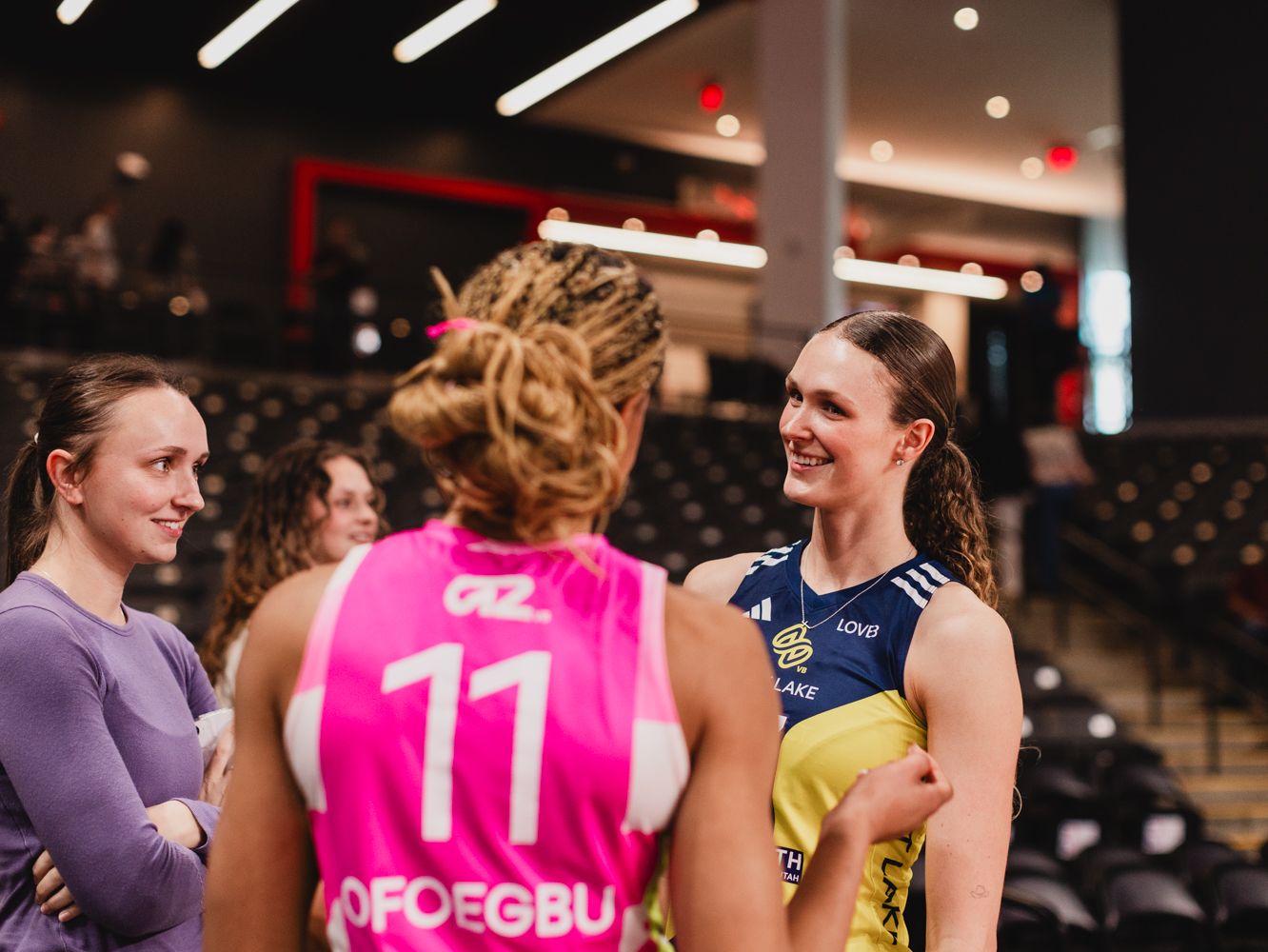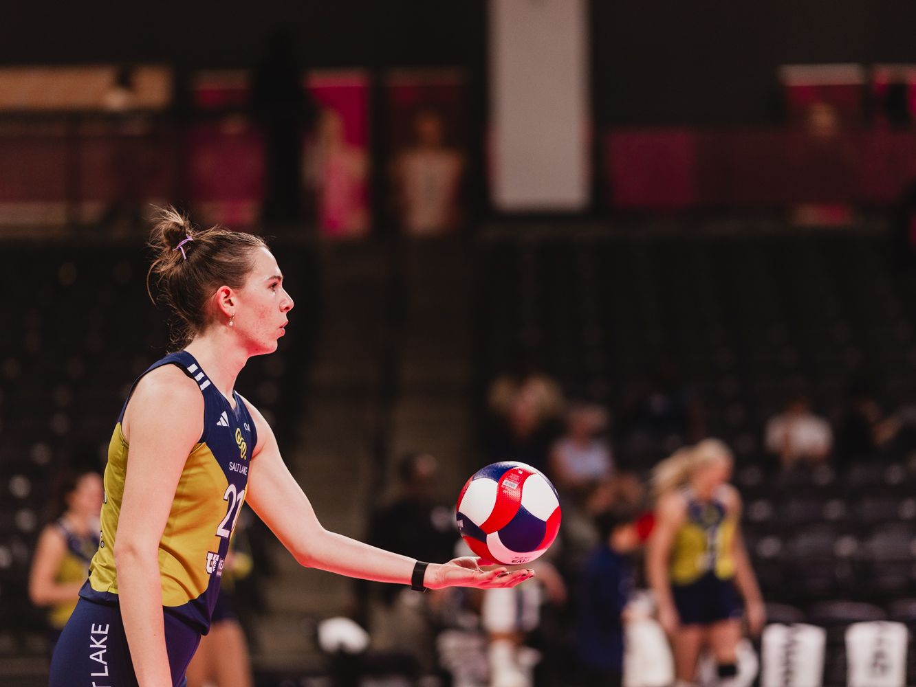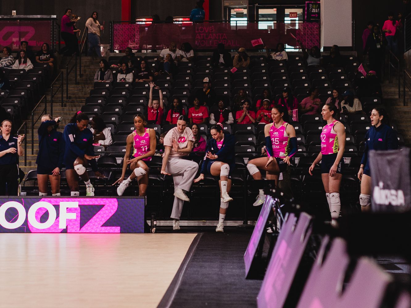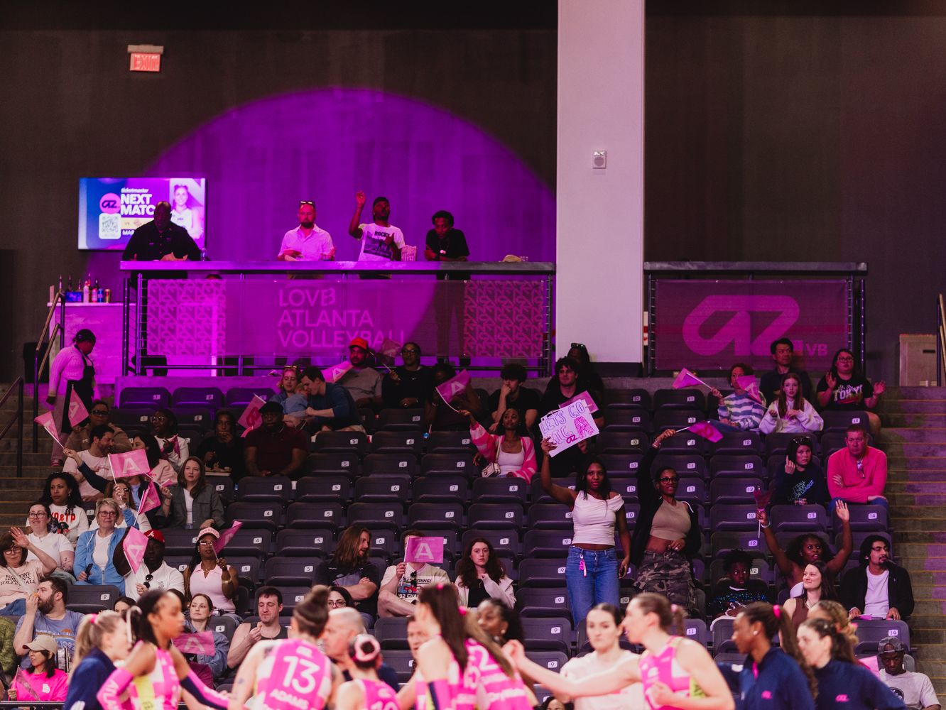 The atmosphere at Gateway Center was electric, as usual, but with a unique twist that added to the excitement. Instead of the usual “fan” experience, attendees were given flags to wave, creating a sea of pink throughout the arena. The SLC away fans section, dressed in bright yellow, brought incredible energy to the building—arguably the loudest visiting section of the season so far. Their signs and constant noise made it clear they traveled to support their team. But what happened after the final whistle truly captured the spirit of the league: ATL players walked over to greet both SLC fans and players, sharing smiles, hugs, and photos. It was a beautiful reminder that while the competition is fierce, the LOVB community is built on love for the game and each other.